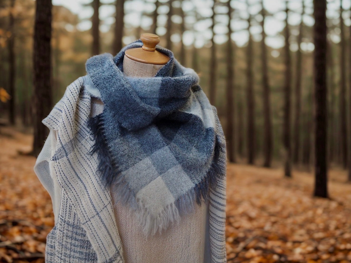 装着の際は先ず一重で首にかけ、三角の部分を首に密着させてからストールを上に引き上げ、ねじって頭を通して二重にして下さい。)