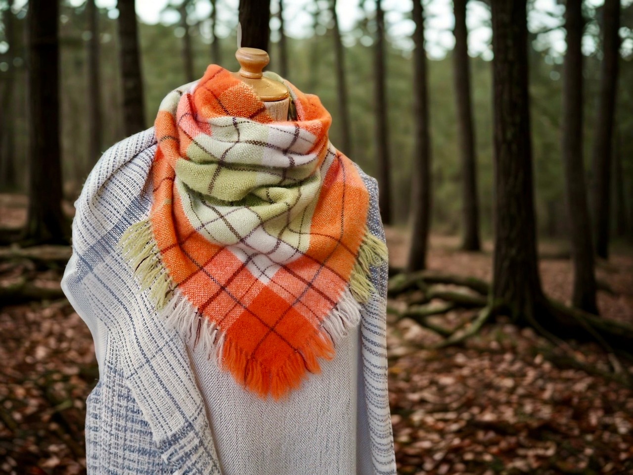 装着の際は先ず一重で首にかけ、三角の部分を首に密着させてからストールを上に引き上げ、ねじって頭を通して二重にして下さい。)